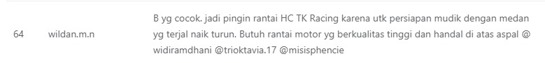 Selamat kepada _masojol11 yang berhasil mendapatkan Satu Pcs HC CHAIN RED 428 – 140 berdasarkan hasil undi dan jawaban yang benar sesuai syarat dan ketentuan berlaku.