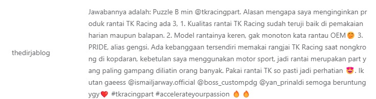 Selamat kepada thedirjablog yang berhasil mendapatkan Satu Pcs HC CHAIN GREEN 428 – 140 berdasarkan hasil undi dan jawaban yang benar sesuai syarat dan ketentuan berlaku.