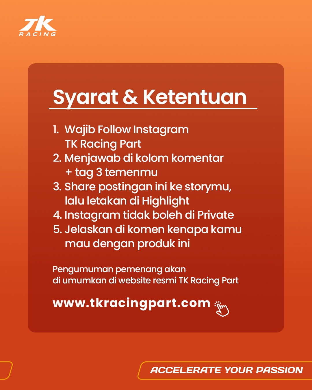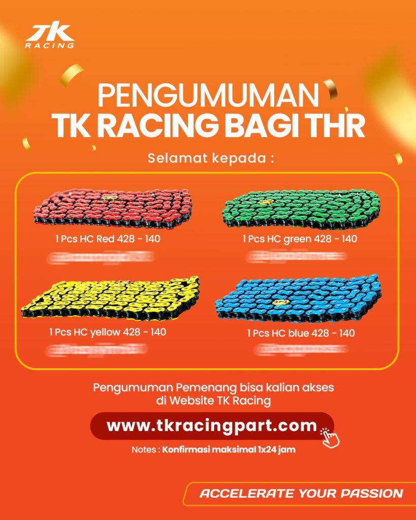 Untuk para pemenang yang mendapatkan THR TK RACING , silahkan memberikan konfirmasi ke DM Instagram TK RACING paling lambat 1×24 jam ( pukul 18:00 WIB 31 Maret 2024)